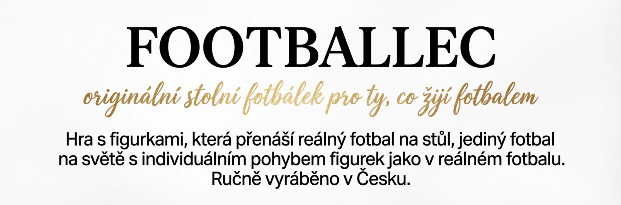 Není to jenom hra, ale designový objekt. Každý kus je ručně vyráběný. Footballec je Inspirován skutečným fotbalem. Vypadá skvěle doma, v kanceláři i v herně. Rádi pro vás vyrobíme hru s kolekcí evropských, českých nebo jiných klubů, případně podle vašich představ, ale nemůžeme tady uvádět veškerý výčet mužstev. Pokud chcete mít kluby jako je Barcelona, Bayern nebo Slavia a ta se nám sakra povedla, neváhejte a ozvěte se nám, budeme jenom rádi! Zapomeň na chaotické mlácení do míčku. U FOOTBALLECu musíš přemýšlet jako při skutečném fotbale: